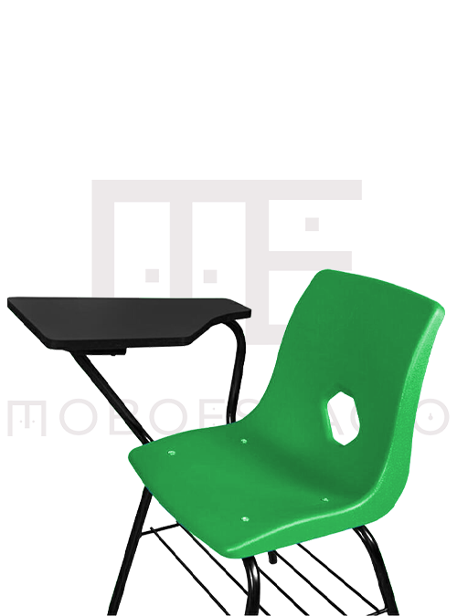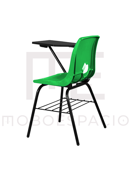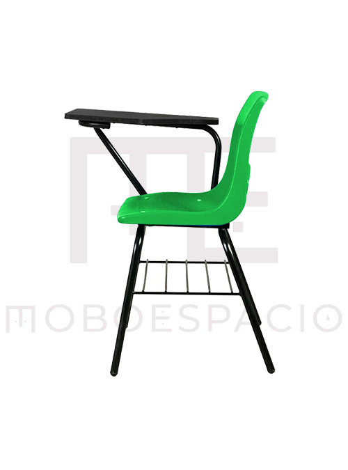 Estructura de acero tubular redondo de 1 pulgada terminada en pintura electroestática color negro horneada a 200 grados centígrados, cuenta con parrilla porta libros y una concha anatómica para el asiento y respaldo. Paleta de polipropileno de alta densidad en colores gris o negro
